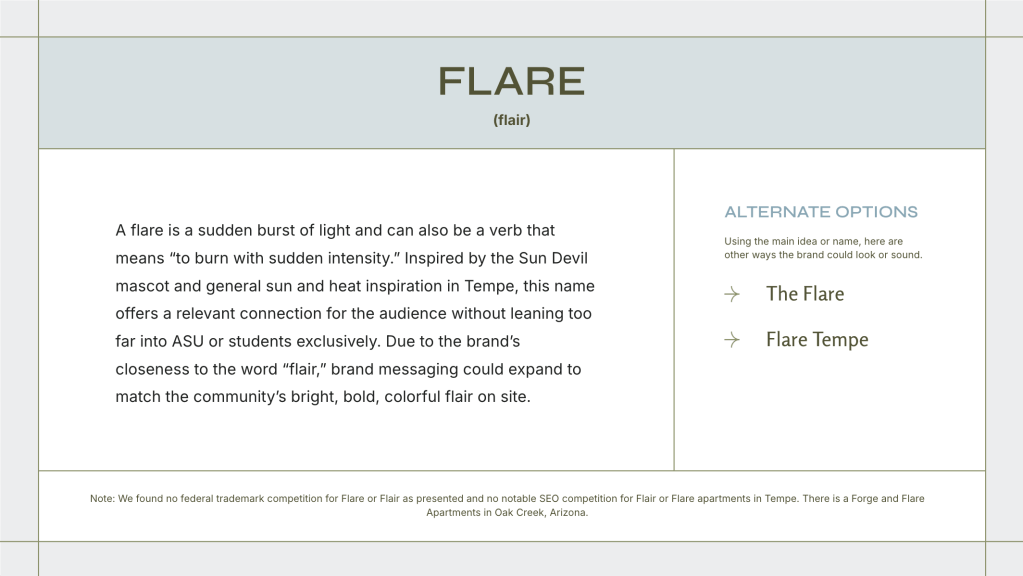 After Flare, we continued to rebrand Park Place Arlington, then Park Place Reno. These rebrands have not yet been announced in their markets; both were also round-one name selections with no edits (announcement coming soon!).
